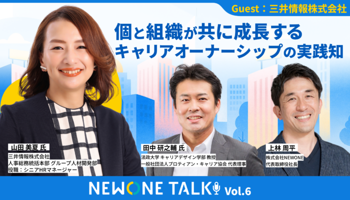※本動画は、2025年12月10日に行われた株式会社NEWONEのセミナーを録画したものです。NEWONE TALK 第6回のテーマは、「個と組織が共に成長するキャリアオーナーシップの実践知」。ゲストは三井情報株式会社の山田美夏氏です。三井情報グループは、社員の「働きやすさ」を促進するため多様な人材が活躍できる”場”をつくり、社員の「働きがい」を醸成し、“キャリアオーナーシップ”を発揮するための様々な施策に取り組んでいます。実際の取り組みや推進について具体的な事例を交えながらご紹介いただきます。